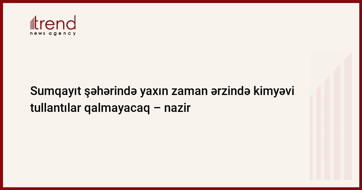 Azərbaycanın ekologiya və təbii sərvətlər naziri bildirib ki, Sumqayıt şəhərində (paytaxt Bakıdan 35 kilometr aralı) yaxın 3-4 il ərzində kimyəvi tullantılar qalmayacaq.