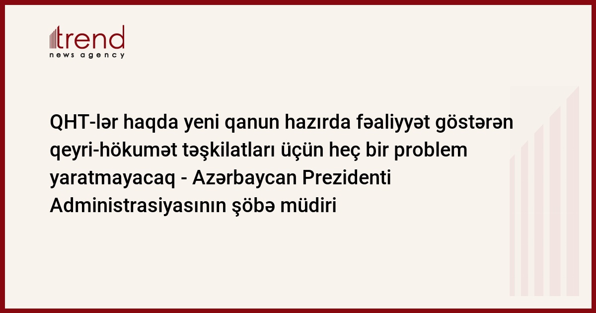 "Yaxınlarda qəbul edilməsi gözlənilən "Azərbaycanın QHT-ləri haqqında" yeni qanun, hazırda fəaliyyət göstərən və yeni yaranmış qeyri-hökumət təşkilatları üçün heç bir problem yaratmayacaq", - şənbə günü jurnalistlərə Azərbaycan Prezidenti Administrasiyasının İctimai-siyasi şöbəsinin müdiri Əli Həsənov deyib.