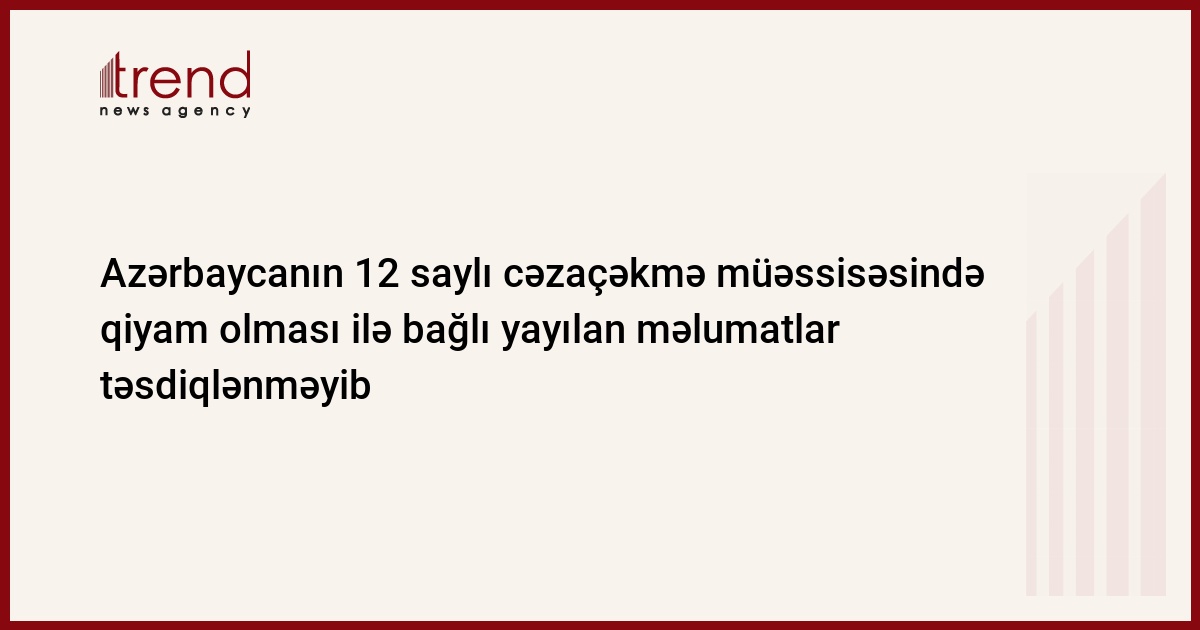 Azərbaycan, Bakı, 16 iyun / Trend , müxbir K.Zərbalıyeva / Azərbycan Ədliyyə Nazirliyinin Penitensiar Xidməti (PX) 12 saylı cəzaçəkmə müəssisəsində qiyam olması ilə bağlı yayılan məlumatları təkzib edir.