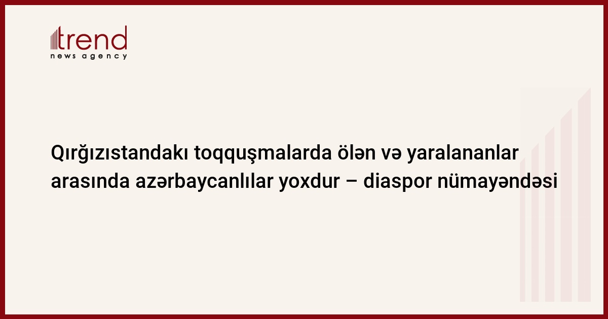 Qırğızıstanın Oş və Cəlalabad vilayətlərindəki toqquşmalarda həlak olan və yaralananlar arasında azərbaycanlılar yoxdur. Bu barədə Trendə "Azəri" Qırğızıstan Azərbaycanlıları İctimai Birliyinin sədr müavini Əsəd Həsənov məlumat verib.