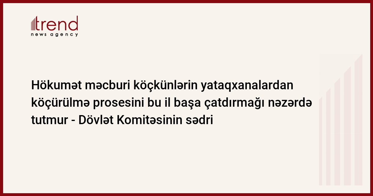 "Bu prosesə bu il başlamaq olar. Yataqxanalardakı məcburi köçkünlər üçün yeni evlərin tikilməsi məqsədilə artıq torpaq ayrılıb, üç-dörd ay ərzində layihə hazır olmalıdır", - Qaçqın və Məcburi Köçkünlərlə İş Üzrə Dövlət Komitəsinin sədri Əli Həsənov cümə axşamı jurnalistlərə bildirib.