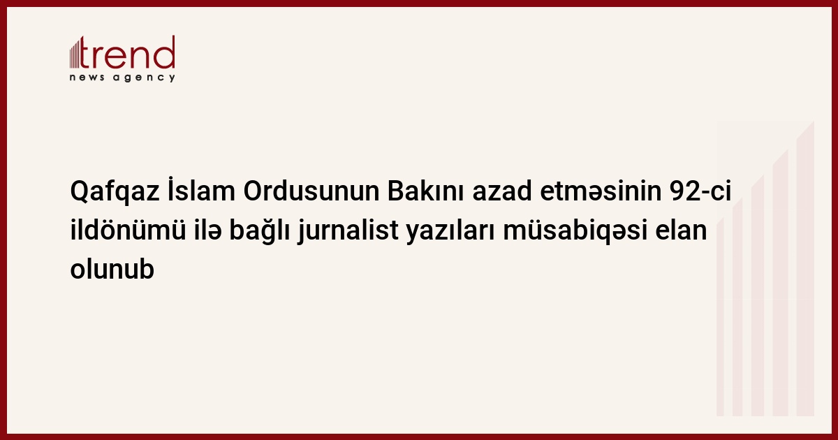 Qafqaz İslam Ordusunun Bakını azad etməsinin 92-ci ildönümünə həsr olunmuş jurnalist yazıları müsabiqəsi elan edilib. Bu barədə cümə axşamı Trend Beynəlxalq İnformasiya Agentliyinin konfrans zalında keçirdiyi mətbuat konfransında Türkiyə Universitetləri Məzunları İctimai Birliyinin sədri Çingiz Bayramov bildirib.