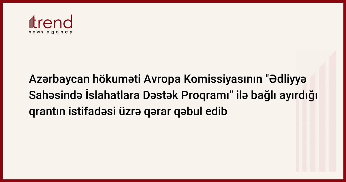 Azərbaycan hökuməti Avropa Komissiyasının "Ədliyyə Sahəsində İslahatlara Dəstək Proqramı" ilə bağlı ayırdığı 14,5 mln avro məbləğində qrant vəsaitinin istifadəsi üzrə tədbirlər planının təsdiq edilməsi haqqında qərar qəbul edib.