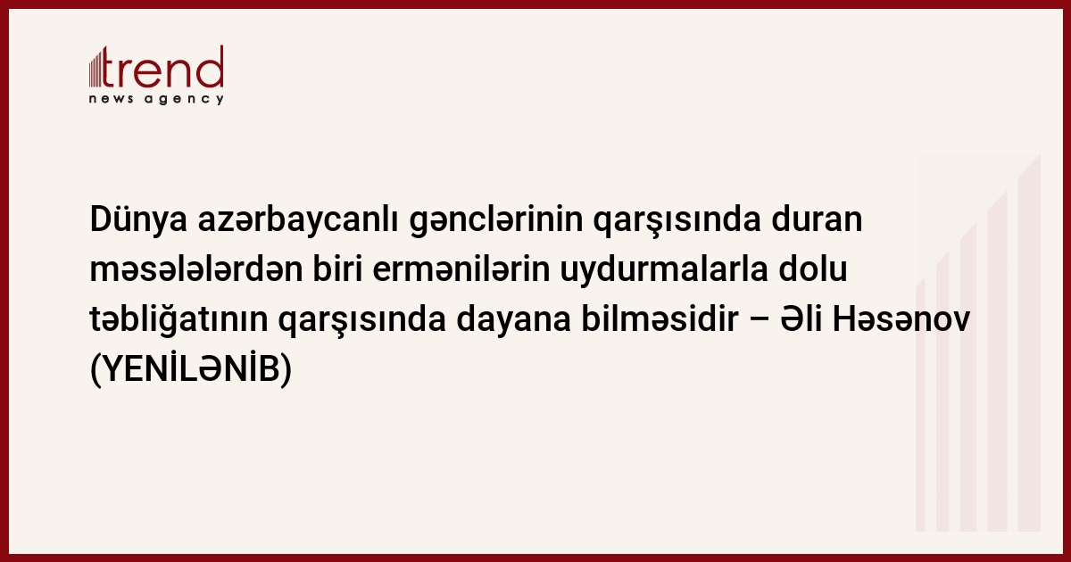 Dünya azərbaycanlı gənclərinin qarşısında duran məsələlərdən biri də milli varlığımızı erməni qəsbkarlarından qorumaq, ermənilərin yalan və uydurmalarla dolu təbliğatının qarşısında dayana bilməsidir, bunu Prezident Administrasiyasının İctimai-siyasi məsələlər şöbəsinin müdiri Əli Həsənov Almaniyanın Frankfurt şəhərində şənbə günü keçirilən Dünya Azərbaycanlı Gənclərinin I Konqresində çıxışı zamanı bildirib.