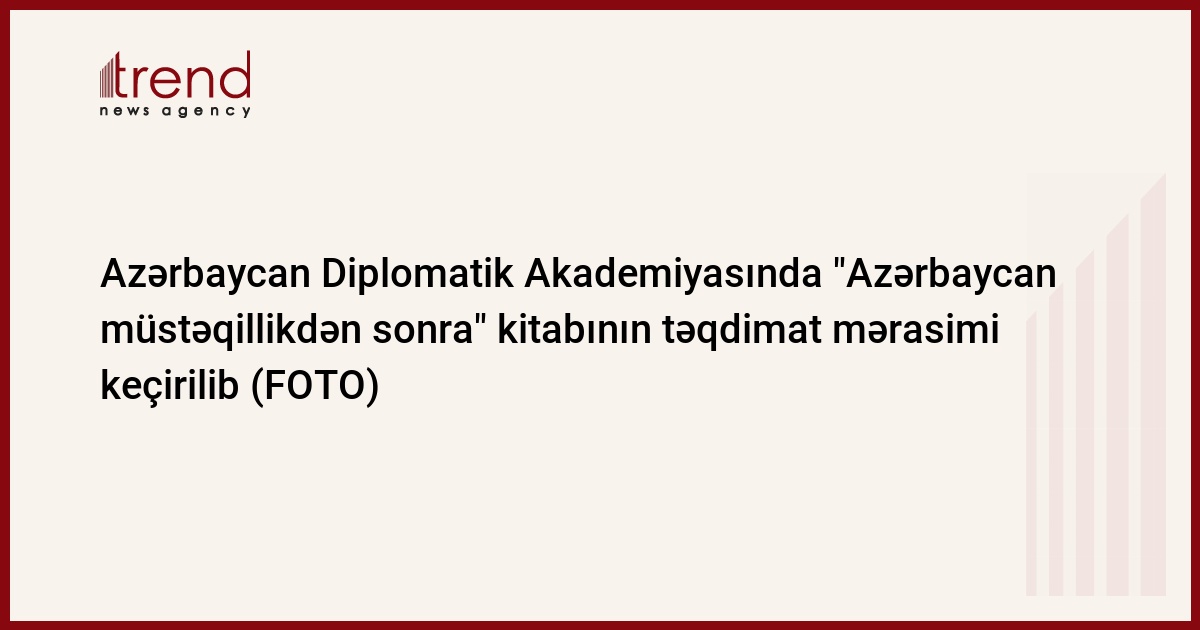 Azərbaycan Diplomatik Akademiyasında (ADA) ABŞ-ın tanımmış Con Hopkins Universitetinin professoru, Orta Asiya və Qafqaz üzrə ekspert Svante Kornelin "Azərbaycan müstəqillikdən sonra" kitabının təqdimat mərasimi keçirilib. Bu barədə çərşənbə axşamı Trend-ə akademiyadan məlumat verilib.