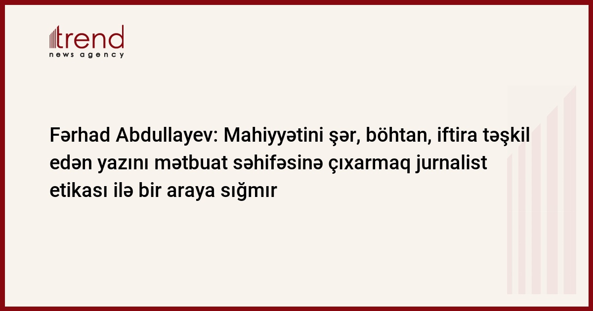 Mahiyyətini şər, böhtan, iftira təşkil edən yazını mətbuat səhifəsinə çıxarmaq jurnalist etikası ilə bir araya sığmır. Bu barədə Azərbaycan Respublikası Konstitusiya Məhkəməsinin sədri Fərhad Abdullayev KİV-də onun dissertasiya işi ilə bağlı yayılan materialları şərh edərkən deyib.