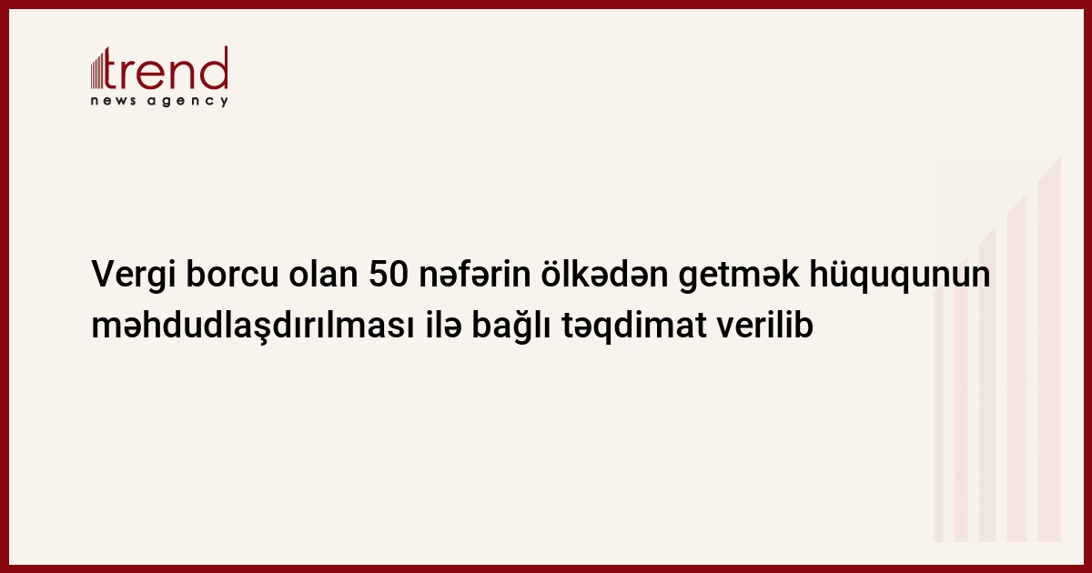 Vergilər Nazirliyinin mətbuat xidmətindən çərşənbə axşamı Trend-ə verilən məlumata görə, Nazirliyin Bakı şəhəri Vergilər Departamenti tərəfindən müsadirə borcu olan 50 fiziki şəxsin ölkədən getmək hüququnun müvafiq qaydada məhdudlaşdırılması istiqamətində tədbirlər görür.