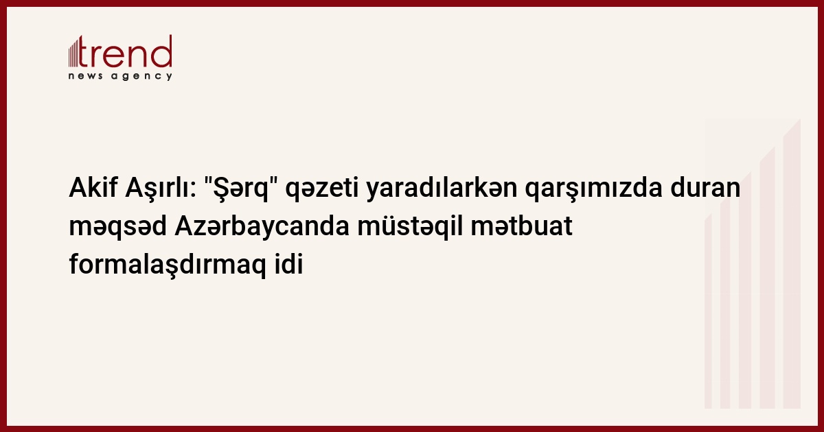 "Şərq" qəzeti yaradılarkən qarşımızda duran məqsəd Azərbaycanda müstəqil mətbuat formalaşdırmaq idi. Bu barədə "Şərq" qəzetinin təsisçisi və baş redaktoru Akif Aşırlı qəzetin yaradılmasının 15 illik yübileyi ilə bağlı Trend-ə verdiyi açıqlamasında bildirib.