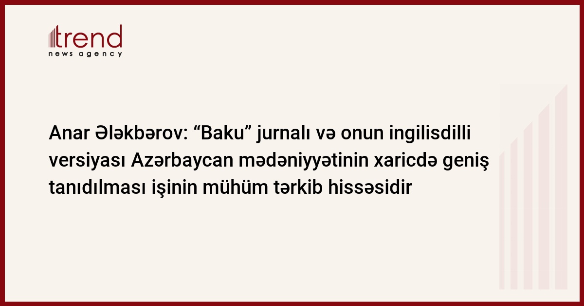 "Baku" jurnalı və onun ingilisdilli versiyası Azərbaycan mədəniyyətinin daha geniş coğrafiyada tanıdılması işinin mühüm tərkib hissəsidir. Heydər Əliyev Fondunun icraçı direktoru, populyar "Baku" jurnalının ingilisdilli versiyasının Moskvada təqdimat mərasimində iştirak etmiş Anar Ələkbərov bu fikri AzərTAc-a məxsusi müsahibədə söyləmişdir.