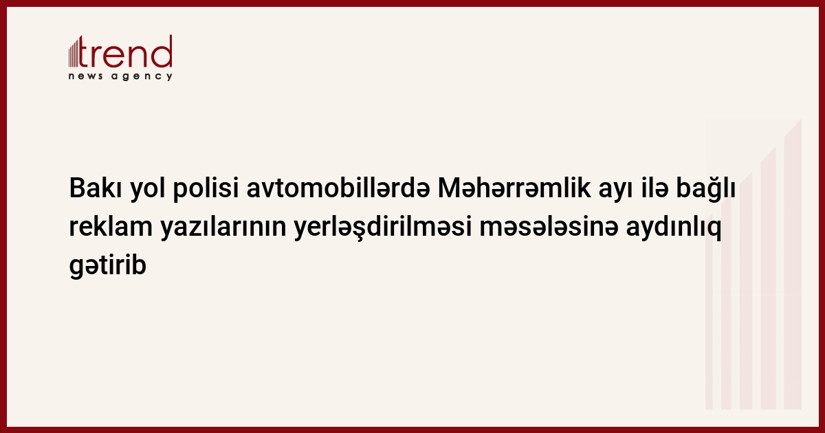 Bakı şəhər yol polisi avtomobillərdə Məhərrəmlik ayı ilə bağlı reklam yazılarının yerləşdirilməsinin qanunauyğun olub-olmamasına aydınlıq gətirib.