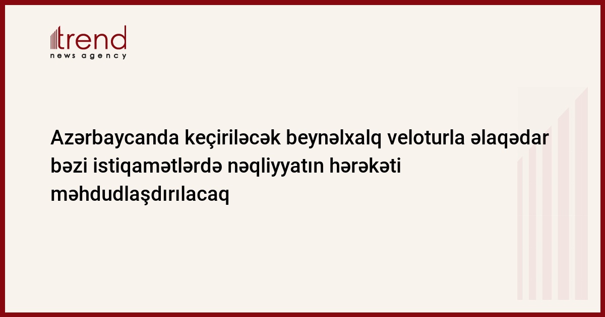 Azərbaycanda keçiriləcək beynəlxalq velosiped turniri ilə əlaqədar mayın 9-dan 13-dək paytaxtda və respublikanın bəzi istiqamətlərində nəqliyyatın hərəkəti məhdudlaşdırılacaq.