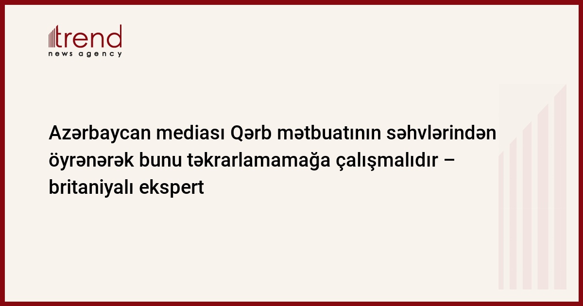 Azərbaycan mediası Qərb mətbuatının səhvlərindən öyrənərək bunu təkrarlamamağa çalışmalıdır. Trend-in məlumatına görə, bunu çərşənbə günü "Azərbaycanda media mühiti: mövcud durum və yeni çağırışlar" mövzusunda Bakıda keçirilən beynəlxalq konfransda Böyük Britaniya Milli Jurnalistlər İttifaqının eksperti Arjuman Vacid bildirib.