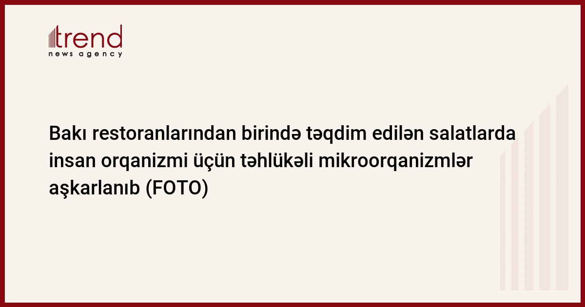 Müəssisə tərəfindən hazırlanmış "mimoza" və "paytaxt" salatlarından götürülmüş nümunələrin Komitənin Təcrübə-Sınaq Mərkəzində (AzTEST) sınaqlarının nəticələrinə əsasən hər iki məhsulda bağırsaq çöpləri qrupundan olan bakteriyalar və "e.coli" mikroorqanizmləri müəyyən olunmuşdur.