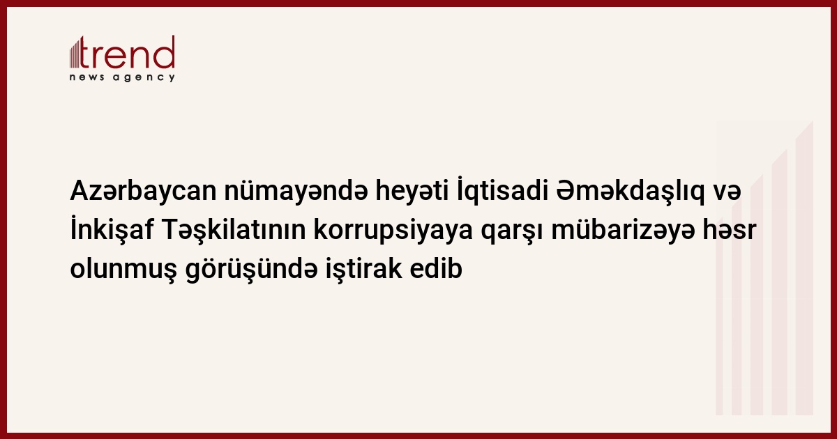 Trend-in məlumatına görə, Azərbaycan nümayəndə heyətinin tərkibində eyni zamanda, Korrupsiyaya qarşı mübarizə üzrə Komissiyasının katibi Vüsal Hüseynov, Baş Prokuror yanında Korrupsiyaya Qarşı Mübarizə İdarəsinin rəisi Kamran Əliyev və idarənin böyük prokuroru Elnur Musayev yer alıb.