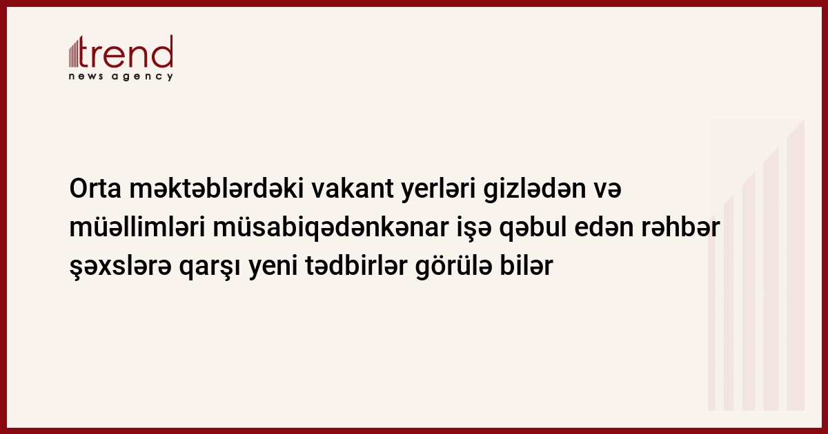 Azərbaycanda vakant yerlər barədə düzgün məlumat verməyən, müəllimlərin müsabiqədənkənar işə qəbuluna yol verən yerli təhsili idarəetmə orqanları və ümumi təhsil müəssisələri rəhbərləri barəsində intizam tənbehi tədbirlərinin tətbiq edilməsinə dair təkliflər hazırlanacaq.
