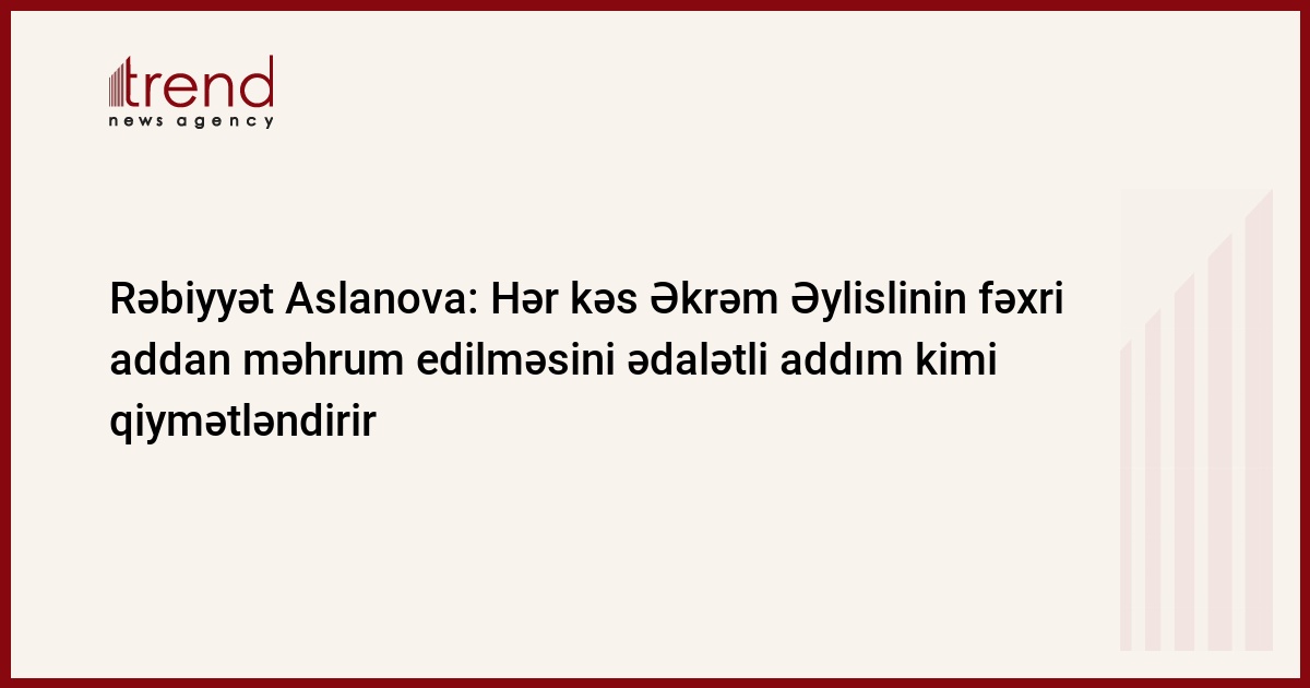 Azərbaycan Prezidentinin Əkrəm Əylislini həm Prezidentin fərdi təqaüdündən, həm də "Xalq yazıçısı" fəxri adından məhrum etməsini hər kəs ədalətli bir addım kimi qiymətləndirir. Bunu Trend-ə açıqlamasında Milli Məclisin İnsan hüquqları komitəsinin sədri Rəbiyyət Aslanova deyib.