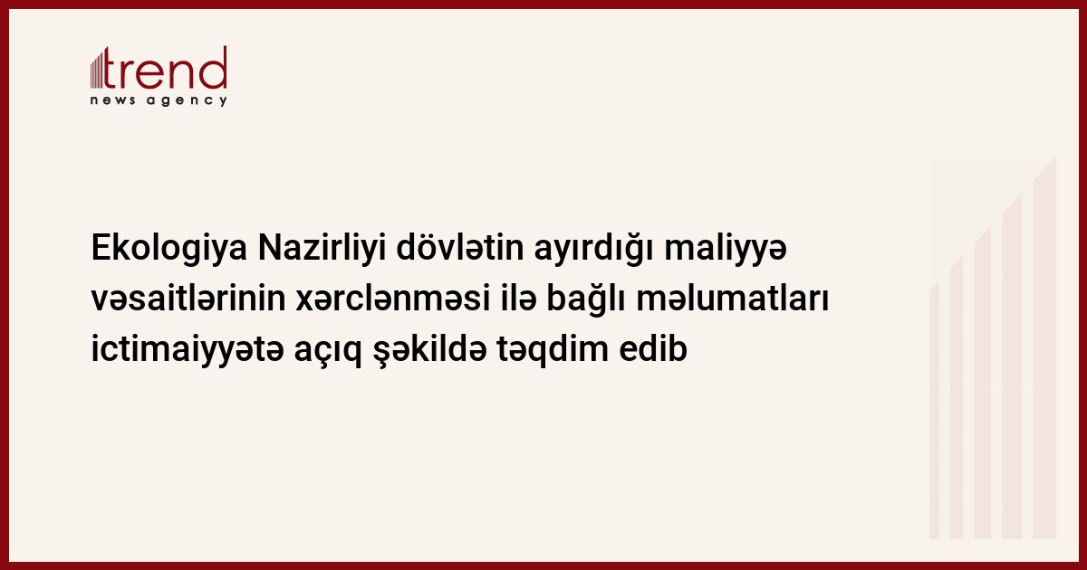 Ekologiya və Təbii Sərvətlər Nazirliyi bu quruma dövlət büdcəsindən ayrılmış maliyyə vəsaitlərinin istifadəsi, xərclənməsi və istifadə edilməmiş vəsaitlərin dövlət büdcəsinə geri qaytarılması vəziyyəti ilə də bağlı məlumatları ictimaiyyətə açıq şəkildə təqdim edib. Nazirliyin mətbuat xidmətindən şənbə günü Trend-ə verilən məlumata görə, bu barədə tam məlumatı nazirliyin saytındakı "Maliyyə" bölümündən (http://www.eco.gov.az/s-icra%20gostericisi10.php) almaq olar.