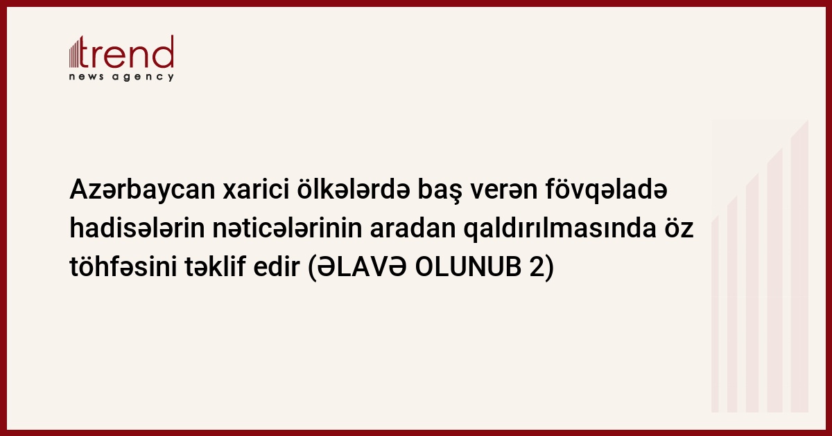 "Ötən dövr ərzində nazirliyin aidiyyatı qüvvələri dünyanın müxtəlif ölkələrində baş vermiş fəlakətlər zamanı çevik şəkildə axtarış xilasetmə əməliyyatlarına qoşulmaqla istər baş vermiş fəlakətin qarşısının alınmasında, istərsə də insanların həyatının xilas olunmasında yaxından iştirak edib", -Tağızadə əlavə edib.