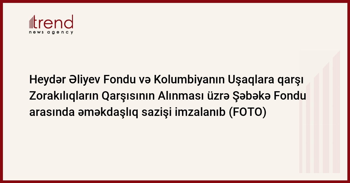 Görüşün sonunda Heydər Əliyev Fondu və Kolumbiyanın Uşaqlara qarşı Zorakılıqların Qarşısının Alınması üzrə Şəbəkə Fondu arasında əməkdaşlıq haqqında saziş imzalanıb.