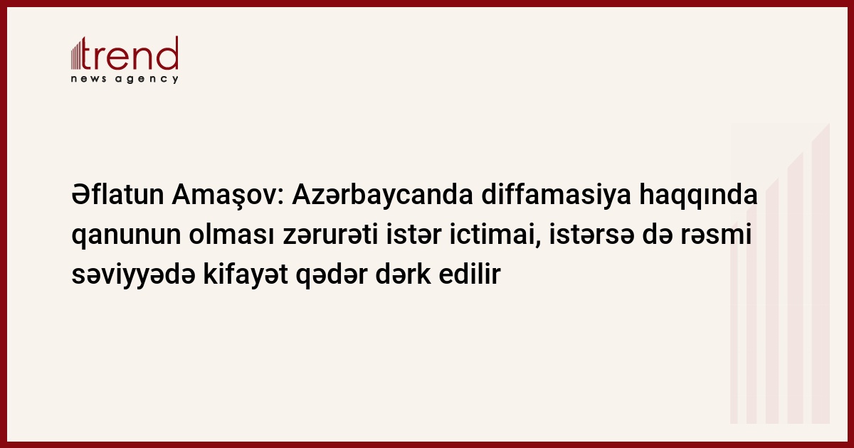Ümumən Azərbaycanda diffamasiya haqqında qanunun olması zərurəti istər ictimai, istərsə də rəsmi səviyyədə kifayət qədər dərk edilir. Trend-in məlumatına görə, bunu Azərbaycan Mətbuat Şurasının sədri Əflatun Amaşov Azərbaycan jurnalistlərinin VI qurultayında çıxışı zamanı deyib.