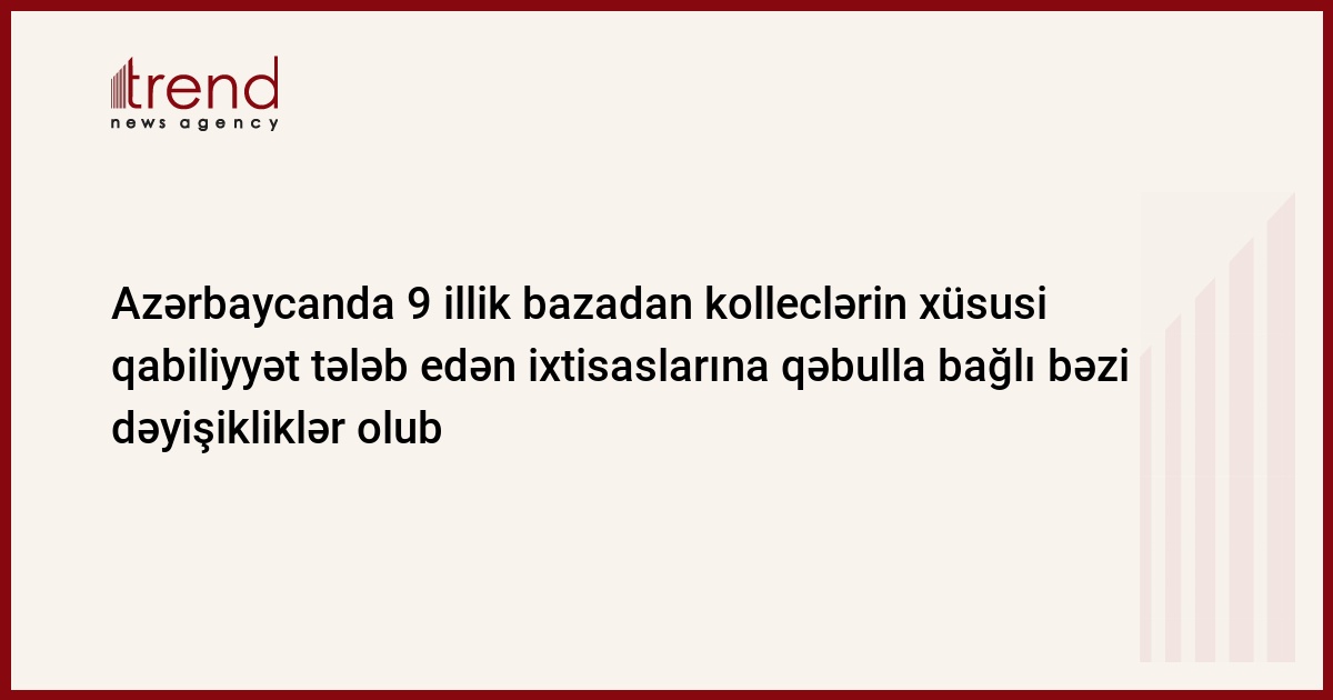 Azərbaycanda 9 illik təhsil bazasından orta ixtisas təhsili müəssisələrinin xüsusi qabiliyyət tələb edən bir neçə ixtisasına qəbulla bağlı bəzi dəyişikliklər olub.