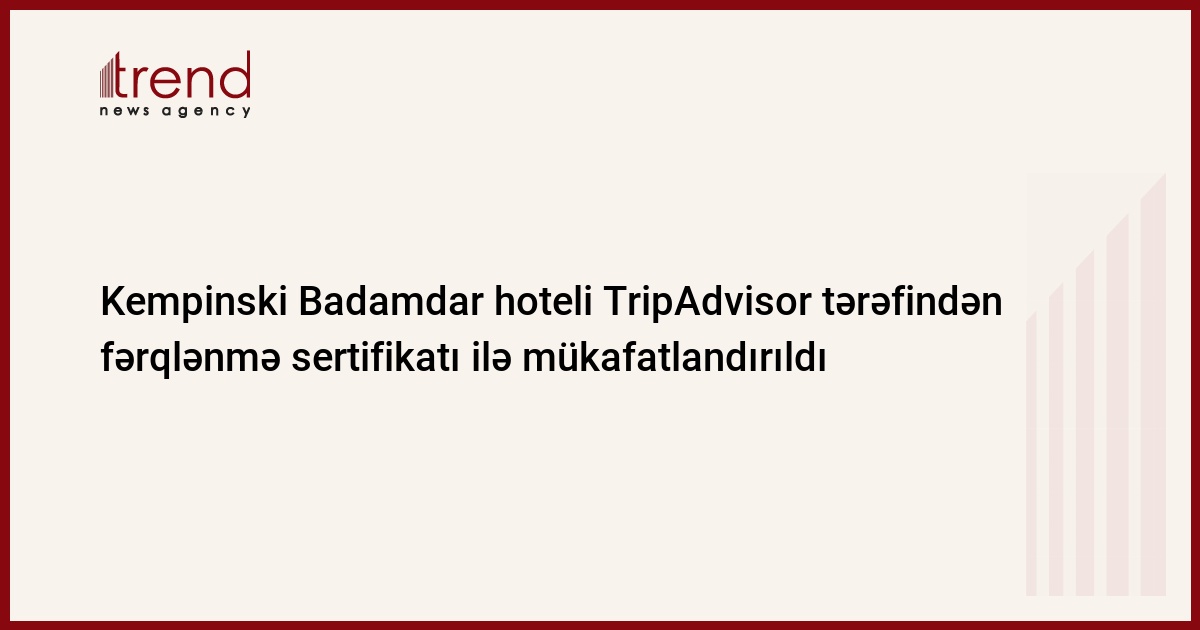 Kempinski Badamdar hoteli 2013-cü il üçün TripAdvisor tərəfindən Fərqlənmə Sertifikatı ilə mükafatlandırıldı. Bu barədə Trend-ə cümə axşamı hoteldən məlumat verilib.