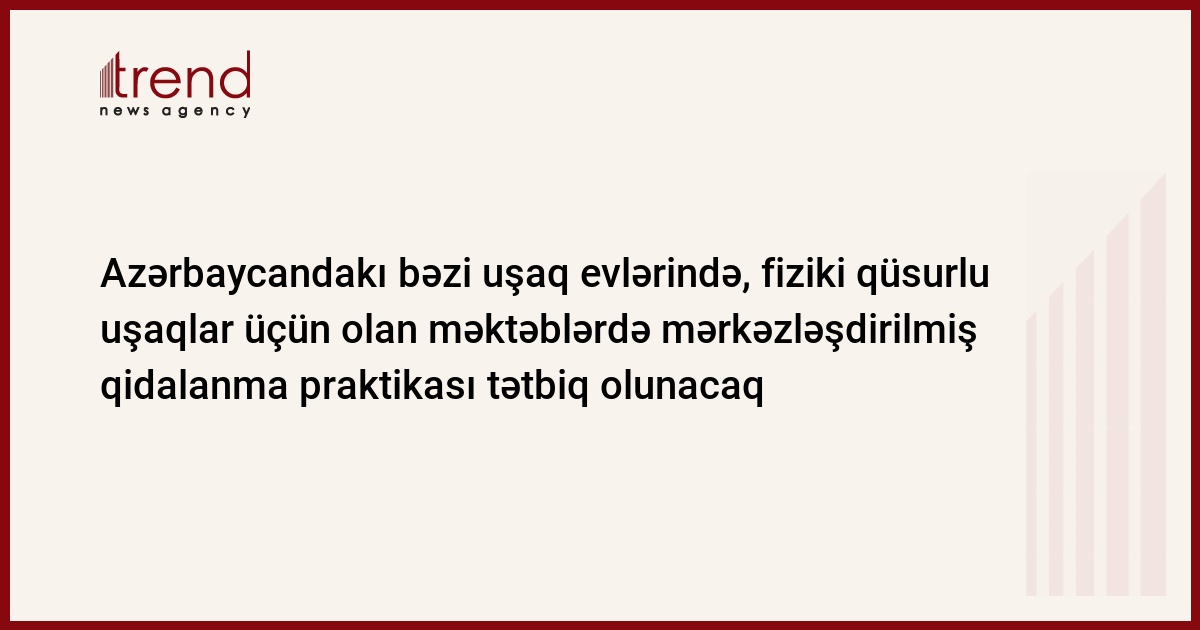 Bakıda və Abşeron yarımadasındakı uşaq evlərində, fiziki qüsurlu uşaqlar üçün olan təhsil müəssisələrində mərkəzləşdirilmiş qidalanma praktikası tətbiq olunacaq. Trend-in məlumatına görə, Azərbaycanın təhsil naziri Mikayıl Cabbarov jurnalistlərə bildirib ki, sentyabrın 16-dan Bakıda və Abşeron yarımadasında fəaliyyət göstərən uşaq evlərində, fiziki qüsurlu uşaqlar üçün olan təhsil müəssisələrində uşaqların yaşı, qidaların kalorililiyi, vitamin tərkibi nəzərə alınmaqla mərkəzləşdirilmiş qidalanma praktikası tətbiq olunacaq: