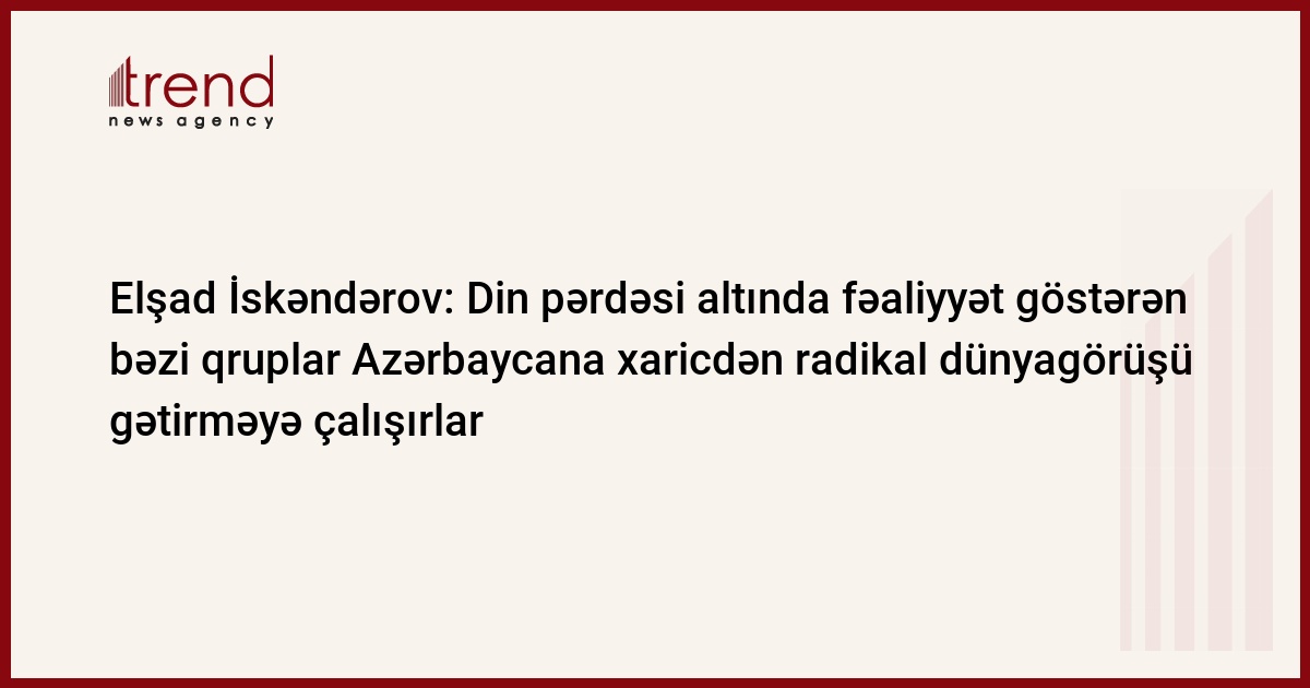 Din pərdəsi altında fəaliyyət göstərən bəzi qruplar Azərbaycana xaricdən radikal dünyagörüşü gətirməyə cəhd edir, burada təşəkkül tapmış tolerant modelə zərbə vurmağa çalışırlar.