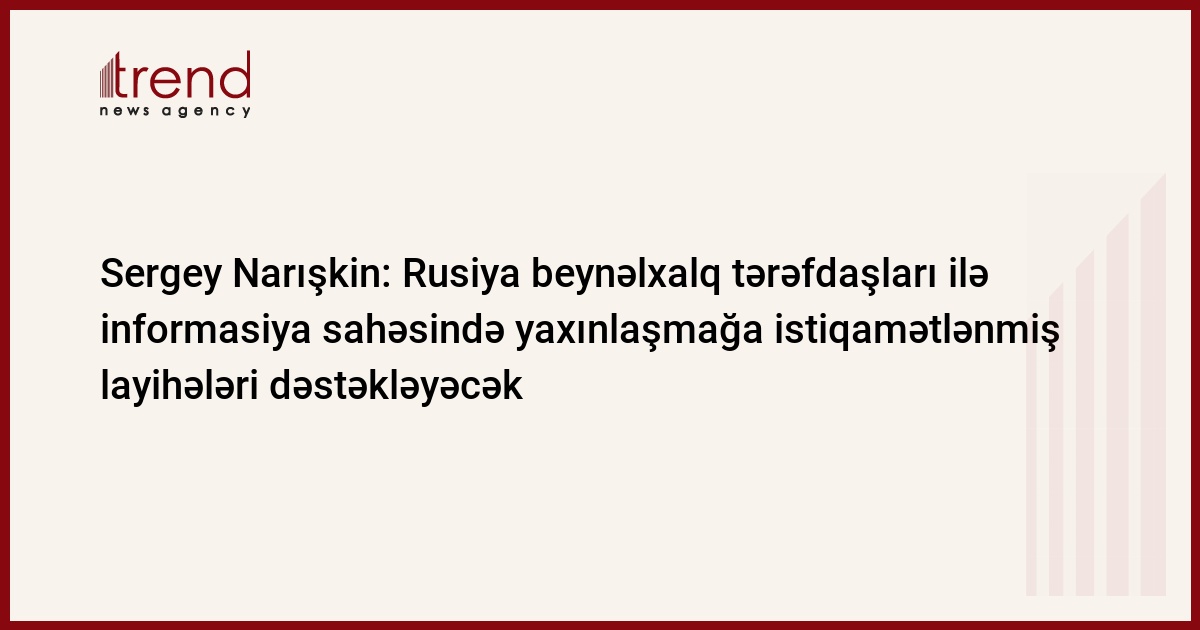 Rusiya bundan sonra da beynəlxalq tərəfdaşları ilə informasiya sahəsində yaxınlaşmağa istiqamətlənmiş layihələri hazırlayacaq və dəstəkləyəcək. Trend-in məlumatına görə, bu barədə Rusiya Dövlət Dumasının sədri Sergey Narışkinin şənbə günü Moskvada öz işinə başlamış III Beynəlxalq Rusdilli Yayımçılar Konqresinin iştirakçılarına ünvanladığı müraciətdə deyilir.