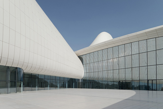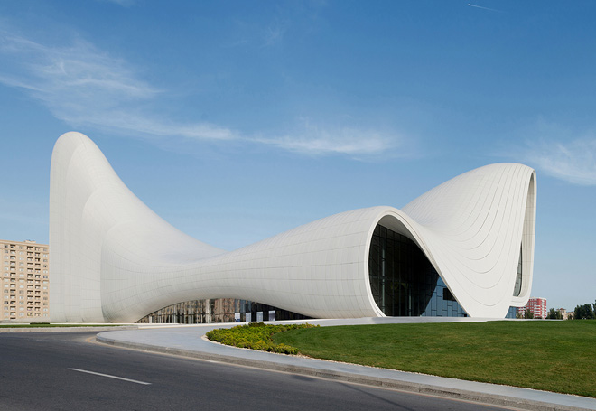 Heydər Əliyev Mərkəzinin unikal arxitektur quruluşa malik binası Azərbaycanın dinamik inkişafını, beynəlxalq aləmdəki birincilik uğrunda hədəflərini təcəssüm etdirir.