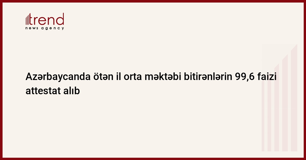 Azərbaycanda 15 və yuxarı yaşda olan əhalinin hər 1000 nəfərindən 969-u ali, orta ixtisas və orta təhsilə malikdir. Dövlət Statistika Komitəsindən Trend-ə verilən məlumata görə, ilkin məlumatlara əsasən, 2013/2014-cü tədris ilinin əvvəlinə ölkənin 4477 dövlət və 28 qeyri-dövlət əyani ümumi təhsil müəssisəsində 1,3 milyon şagird təhsil alıb.