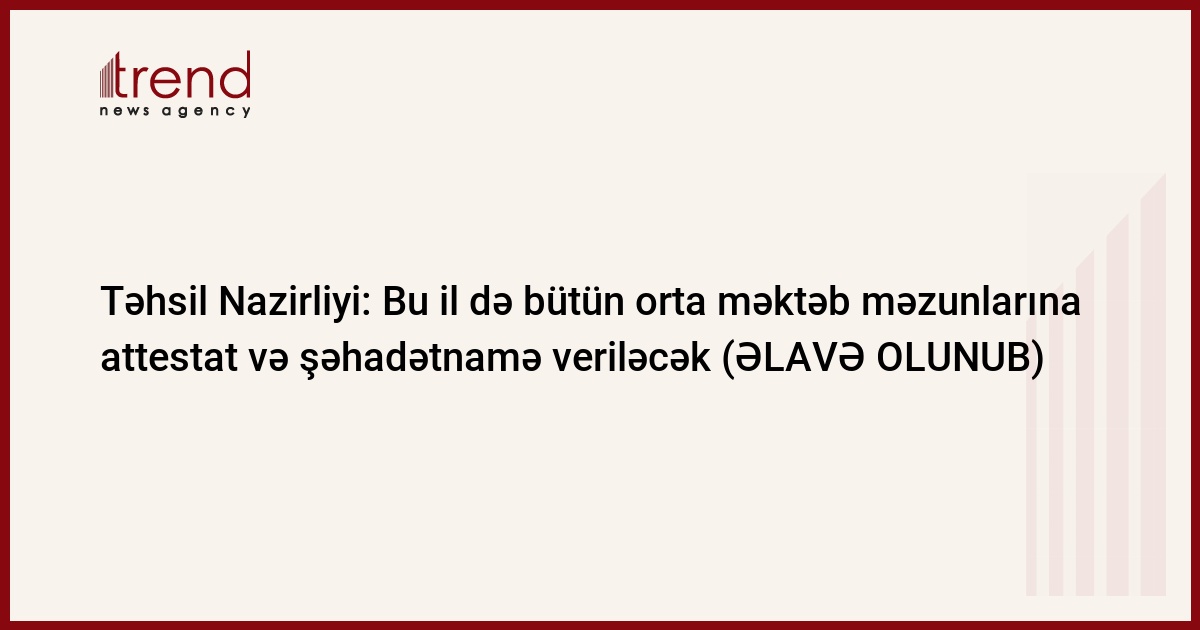 Ötən il olduğu kimi, bu il də hər hansı fəndən "iki" qiyməti almasından asılı olmayaraq, orta məktəbin bütün 11-ci sinif məzunlarına attestat, 9-cu sinif məzunlarına şəhadətnamə veriləcək. Trend-in məlumatına görə, bunu jurnalistlərə təhsil nazirinin müavini Ceyhun Bayramov deyib.