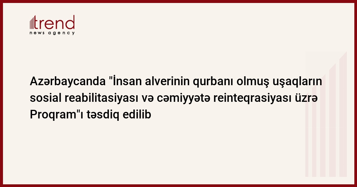 Trend Nazirlər Kabinetinin rəsmi saytına istinadən məlumat verir ki, Proqram insan alverinin qurbanı olmuş uşaqların sosial reabilitasiyası və cəmiyyətə reinteqrasiyası istiqamətində müvafiq tədbirlərin həyata keçirilməsini nəzərdə tutur. İnsan alveri qurbanlarının sosial reabilitasiyası həyata keçirilərkən insan alveri qurbanlarının, xüsusilə uşaqların yaşı, cinsi və tələbatları, o cümlədən zəruri sığınacaq, təhsil və qayğıya olan ehtiyacları nəzərə alınır.