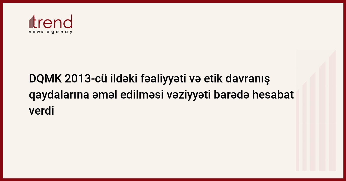 Bu gün Azərbaycan Respublikasının Prezidenti yanında Dövlət Qulluğu Məsələləri üzrə Komissiya (DQMK) "Komissiyanın 2013-cü il üzrə illik fəaliyyəti və etik davranış qaydalarına əməl edilməsi vəziyyəti barədə hesabatları" mövzusunda tədbir keçirib.