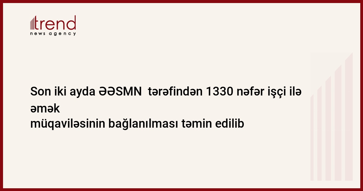 Əmək və Əhalinin Sosial Müdafiəsi Nazirliyi yanında Dövlət Əmək Müfəttişliyi Xidməti (DƏMX) tərəfindən cari ilin yanvar-fevral aylarında ayrı-ayrı müəssisələr üzrə 1330 nəfər işçi ilə əmək münasibətlərinin əmək müqaviləsi əsasında rəsmiləşdirilməsi təmin olunub.