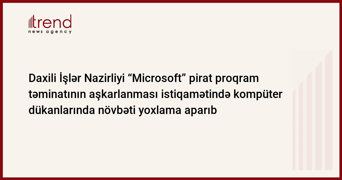 "Microsoft" proqram təminatı üzrə müəllif hüquqlarının pozulması hadisələrinin araşdırılması çərçivəsində Azərbaycan Daxili İşlər Nazirliyinin Baş Mütəşəkkil Cinayətkarlıqla Mübarizə İdarəsi bundan əvvəl apardığı öncədən qurulmuş pirat proqram təminatı ilə kompüterlərin yoxlaması və sınaq tədarükünün ardı olaraq, Bakının kompüter dükanlarında növbəti reyd keçirib.
