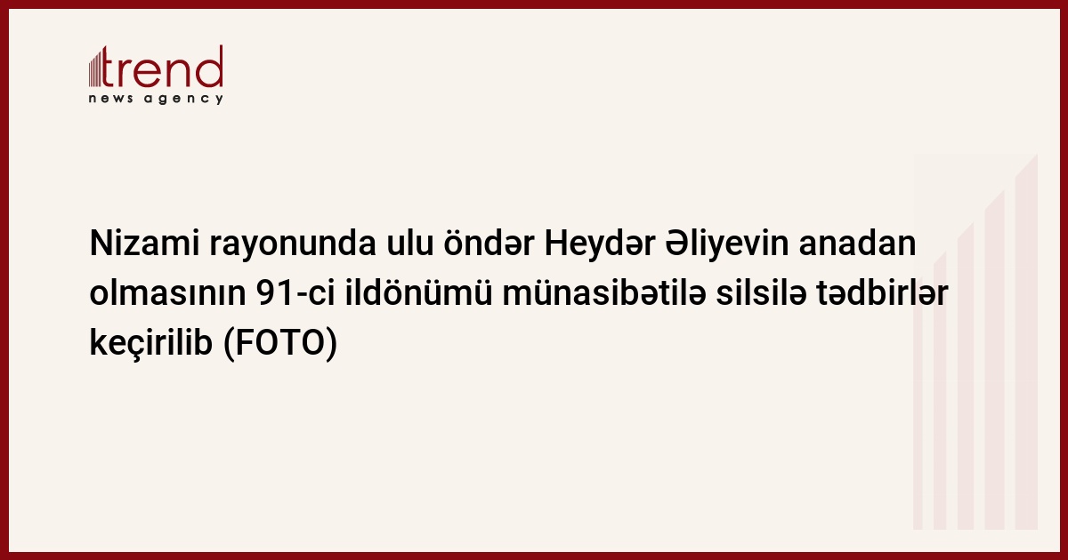 Aprelin 22-də müstəqil Azərbaycan dövlətinin xilaskarı və banisi Ümummilli lider Heydər Əliyevin anadan olmasının 91-ci ildönümü münasibətilə Nizami rayon İcra Hakimiyyəti və Yeni Azərbaycan Partiyası (YAP) Nizami rayon təşkilatı birgə rayon məktəbliləri arasında "breyn-rinq" intellektual yarış keçirib.