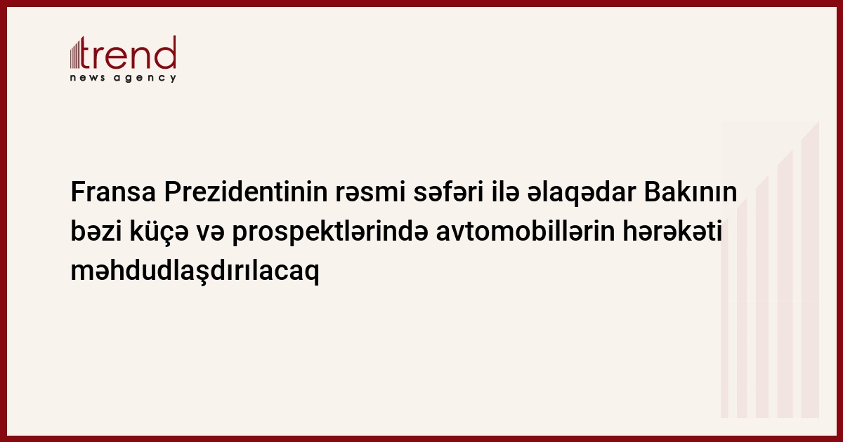 Onun sözlərinə görə, Fransa Prezidentinin Azərbaycana rəsmi səfəri ilə əlaqədar mayın 11-i saat 17:00-dan mayın 12-si saat 16:00-dək paytaxtın bəzi küçə və prospektləri istiqamətində avtomobillərin hərəkətinə müəyyən fasilələrlə məhdudiyyət qoyulmaqla istiqamət dəyişdiriləcək.