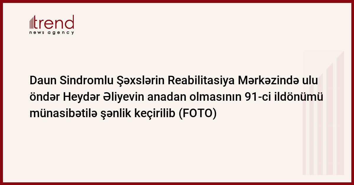 May ayının 9-da Yeni Azərbaycan Partiyası (YAP) Nizami rayon təşkilatının Gənclər Birliyi müstəqil Azərbaycan dövlətinin xilaskarı və banisi Ümummilli lider Heydər Əliyevin anadan olmasının 91-ci ildönümü münasibətilə Daun Sindromlu Şəxslərin Reabilitasiya Mərkəzində şənlik keçirib.