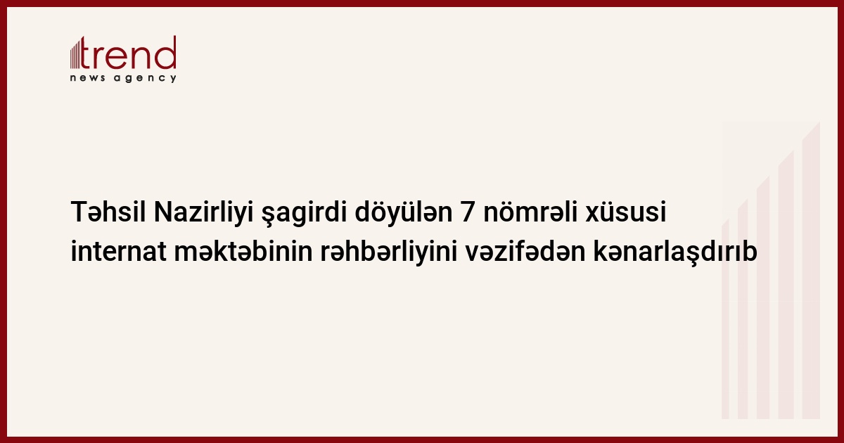 Təhsil Nazirliyi şagirdinin müəllimi tərəfindən döyüldüyü iddia edilən 7 nömrəli xüsusi internat məktəbinin rəhbərliyini və məsələdə adı hallandırılan digər şəxsləri vəzifəsindən müvəqqəti kənarlaşdırıb. Bu barədə Trend-ə Təhsil Nazirliyinin KİV və QHT-lərlə iş sektorunun müdiri Cəsarət Valehov deyib.