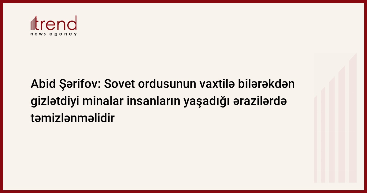 "Sovet ordusunun vaxtilə bilərəkdən gizlətdiyi mina və partlamamış hərbi sursatlar ilk növbədə insanların yaşadığı ərazilərdə təmizlənməlidir". Trend xəbər verir ki, bunu jurnalistlərə açıqlamasında Baş nazirin müavini Abid Şərifov deyib.