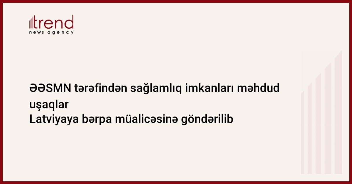 Azərbaycan Respublikasının Əmək və Əhalinin Sosial Müdafiəsi Nazirliyi (ƏƏSMN) tərəfindən 26 nəfər Latviya Respublikasına bərpa müalicəsinə yola salınıb.