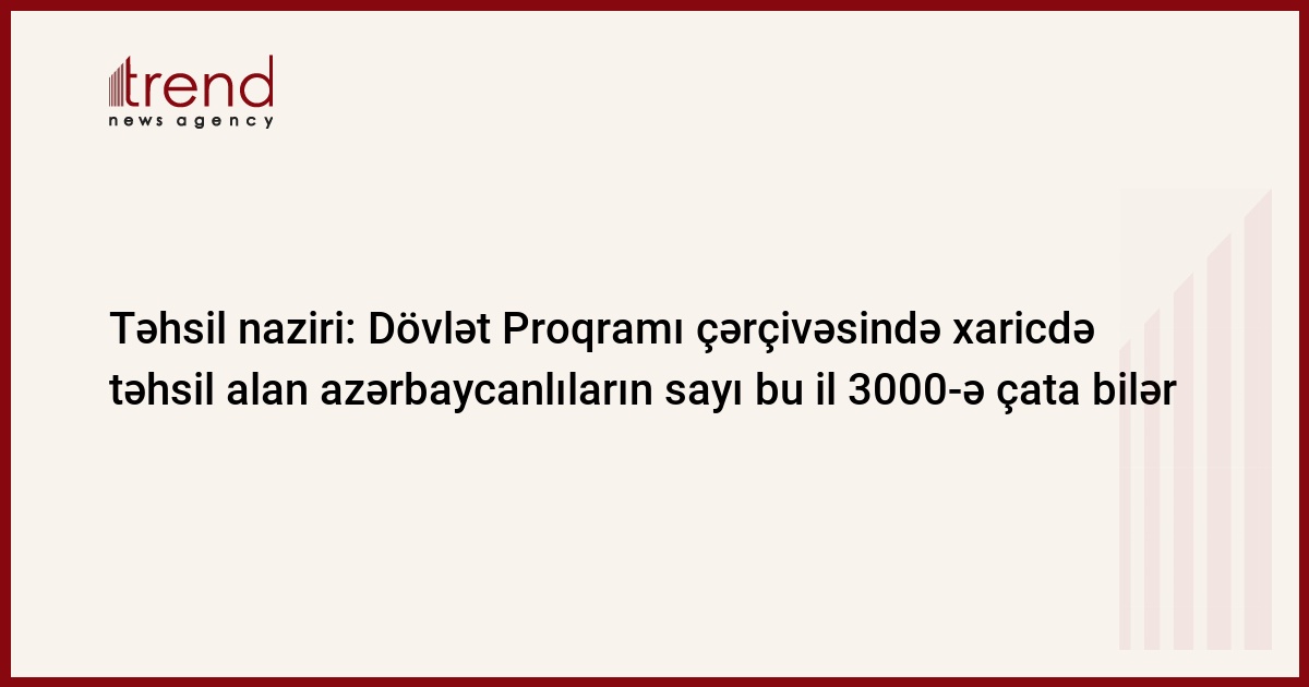 2014-2015-ci tədris ilində xarici ölkələrin ali təhsil müəssisələrində "2007-2015-ci illərdə Azərbaycan gənclərinin xarici ölkələrdə təhsili üzrə Dövlət Proqramı" çərçivəsində xaricdə təhsil alan azərbaycanlı tələbələrin sayının bu il 3000-ə çatacağı gözlənilir. Trend-in məlumatına görə, bunu təhsil naziri Mikayıl Cabbarov 2014-2015-ci tədris ilində xarici ölkələrin ali təhsil müəssisələrində "2007-2015-ci illərdə Azərbaycan gənclərinin xarici ölkələrdə təhsili üzrə Dövlət proqramı" çərçivəsində təhsil almaq üçün Azərbaycan Respublikası Prezidenti yanında Təhsil üzrə Komissiya tərəfindən təsdiq olunmuş ilk tələbələrlə keçirdiyi görüş zamanı deyib.