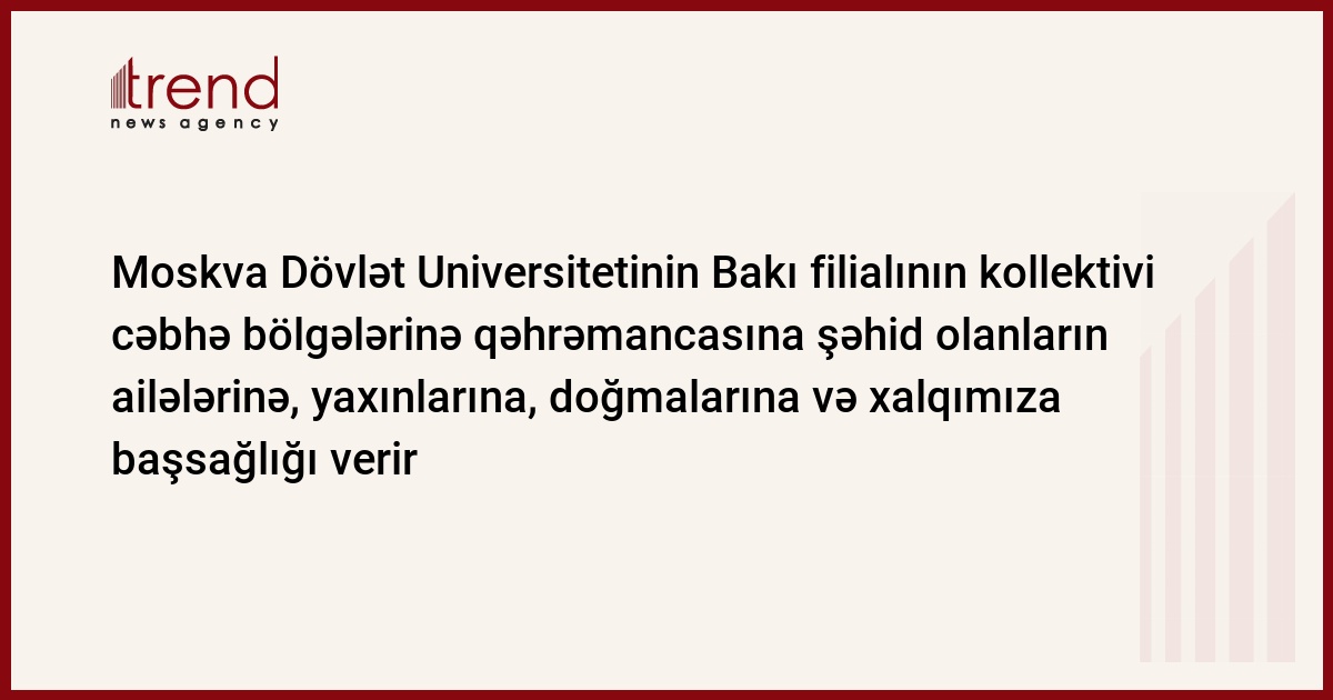 Moskva Dövlət Universitetinin Bakı filialının rəhbərliyi, professor-müəllim heyəti və tələbələri adından Vətən uğrunda canlarından keçən oğullarımızın, şəhidlərimizin ailələrinə, yaxınlarına, doğmalarına və xalqımıza başsağlığı verir, səbr diləyirik.