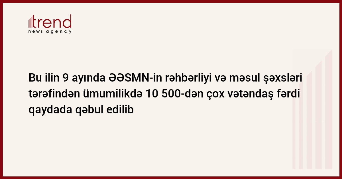 Nazirlikdən Trend-ə verilən məlumata görə, ümumiyyətlə, hesabat dövründə ƏƏSMN-nin rəhbərliyi və məsul şəxsləri tərəfindən qəbul edilən vətəndaşların ümumi sayı ötən ilin müvafiq dövrü ilə müqayisədə 25 faiz çox, yəni 10 555 nəfər olub. Onlardan 948 nəfəri nazirliyin rəhbərliyi, o cümlədən 777 nəfəri nazir, 123 nəfəri nazir müavinləri, 48 nəfəri isə Aparatın rəhbəri tərəfindən qəbul edilib. Digər vətəndaşlar isə nazirliyin aidiyyatı struktur bölmələrinin məsul şəxsləri tərəfindən qəbul edilərək müraciətləri dinlənilib.