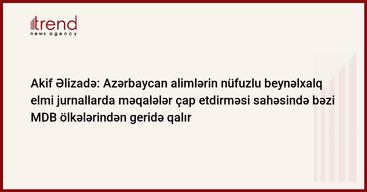 Azərbaycan alimlərin nüfuzlu beynəlxalq elmi jurnallarda məqalələr çap etdirməsi sahəsində bəzi MDB ölkələrindən geridə qalır. Trend-in məlumatına görə, bunu Azərbaycan Milli Elmlər Akademiyasının prezidenti Akif Əlizadə jurnalistlərə bildirib.
