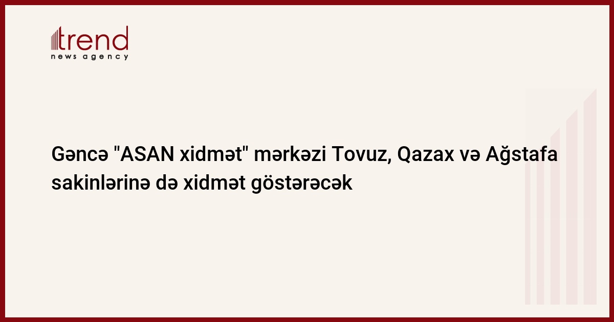 Azərbaycan Respublikasının Prezidenti yanında Vətəndaşlara Xidmət və Sosial İnnovasiyalar üzrə Dövlət Agentliyinin (ASAN xidmət) İctimaiyyətlə əlaqələr sektorundan Trend-ə verilən məlumata görə, dekabrın 1-dən etibarən Dövlət Agentliyinin tabeliyində olan Gəncə "ASAN xidmət" mərkəzi Tovuz, Qazax və Ağstafa rayonlarının ümumi sayı 330 mindən çox sakininə də xidmət göstərəcək.
