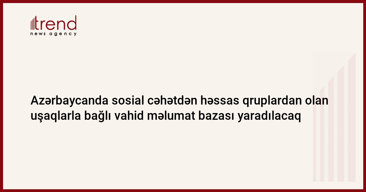 Azərbaycan Respublikası Əmək və Əhalinin Sosial Müdafiəsi Nazirliyi (ƏƏSMN) tərəfindən ölkə üzrə sosial cəhətdən həssas qruplardan olan uşaqlarla bağlı vahid məlumat bazasının yaradılması işlərinə başlanıb.