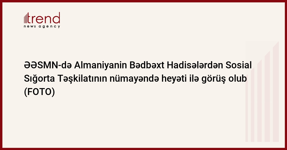 Fevralın 11-də Azərbaycan Respublikasının Əmək və Əhalinin Sosial Müdafiəsi Nazirliyində (ƏƏSMN) ölkəmizdə səfərdə olan Almaniya Federativ Respublikasının Bədbəxt Hadisələrdən Sosial Sığorta Təşkilatının (DGUV) prezidenti Yoakim Bröyerin rəhbərlik etdiyi nümayəndə heyəti ilə görüş olub.