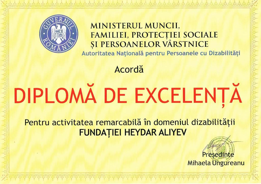 Heydər Əliyev Fondu Rumıniyada əlillərlə iş üzrə yüksək səviyyəli fəaliyyətinə görə, "Mükəmməllik diplomu" ilə təltif edilib. Fonddan Trend-ə verilən məlumata görə, Rumıniyanın Əmək, Ailə, Sosial Müdafiə və Yaşlıların Müdafiəsi Nazirliyi yanında Rumıniya Əlillərin Müdafiəsi Milli Komitəsi tərəfindən verilən bu mükafat Buxarestdə "Kraliça Elizabeta" Liseyinin təşkilatçılığı və Fondun dəstəyi ilə keçirilən 1 iyun - Beynəlxalq Uşaqların Müdafiəsi Gününə həsr olunan tədbir zamanı təqdim edilib.